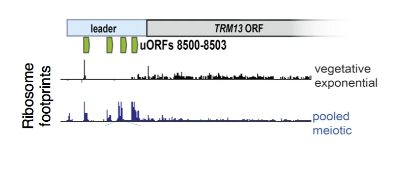uORF translation is enriched in meiotic cells. Ribosome footprints are plotted over a sample gene, TRM13, showing enrichment for ribosomes in the 5' leader region (commonly called the 5'UTR) in meiosis. These uORFs (annotated in green) represent just 4 of over 10,000 uORFs that we identified to be translated in meiosis, suggesting a noncanonical mode of translation in these cells.