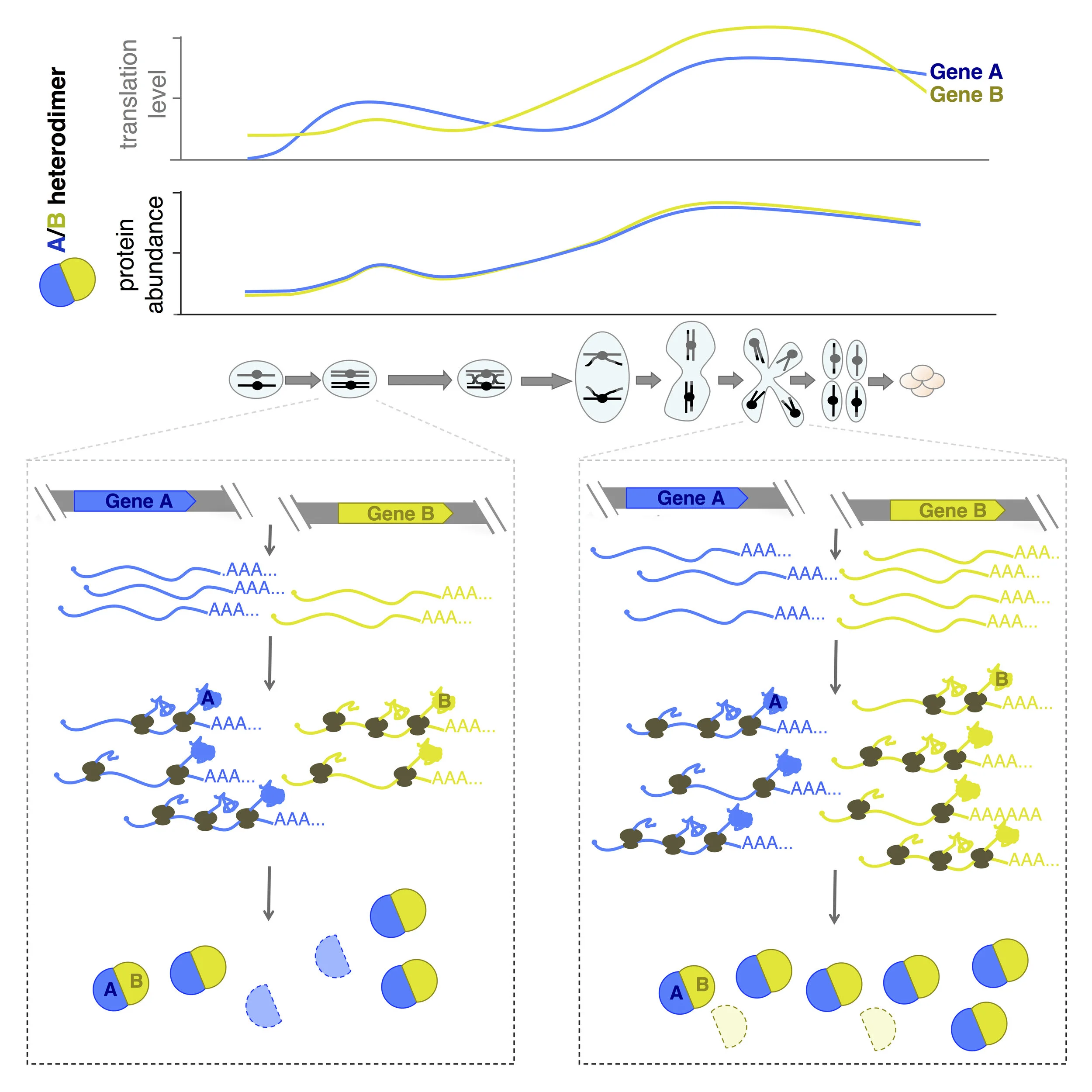 Protein-level matching of physically interacting proteins over time. Top: translation levels over time and protein levels over time are shown for a typical heterodimer during meiosis, revealing high matching specifically at the protein level. Below: our interpretation of the regulation responsible for these patterns, involving protein degradation of uncomplexed partners.
